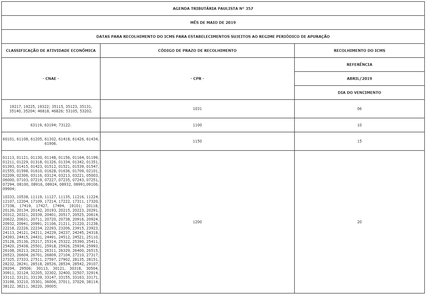 1) O Decreto 45.490, de 30-11-2000 – D.O. de 01-12-2000, que aprovou o RICMS, estabeleceu em seu Anexo IV os prazos do recolhimento do imposto em relação às Classificações de Atividades Econômicas ali indicadas.
