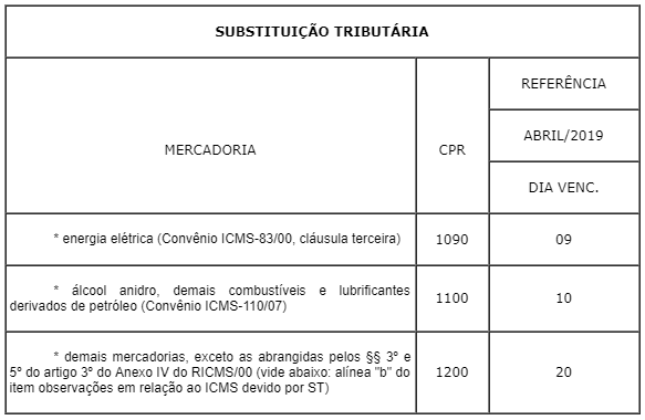 O estabelecimento localizado em outra unidade federada inscrito no Cadastro de Contribuintes do ICMS deste Estado que realizou operações ou prestações destinadas a não contribuinte do imposto localizado neste Estado durante o mês de abril de 2019 deverá preencher e entregar a GIA ST Nacional para este Estado até o dia 10-05-2019 e recolher o imposto devido até o dia 15 de maio, por meio de GNRE (código 10008-0 – ICMS Recolhimentos Especiais). (Convênio ICMS 93/15, cláusulas quarta e quinta; artigo 109, artigo 115, XV-B, XV-C e § 9º, artigo 254, parágrafo único e artigo 3º, § 6º do Anexo IV, todos do RICMS/00).
