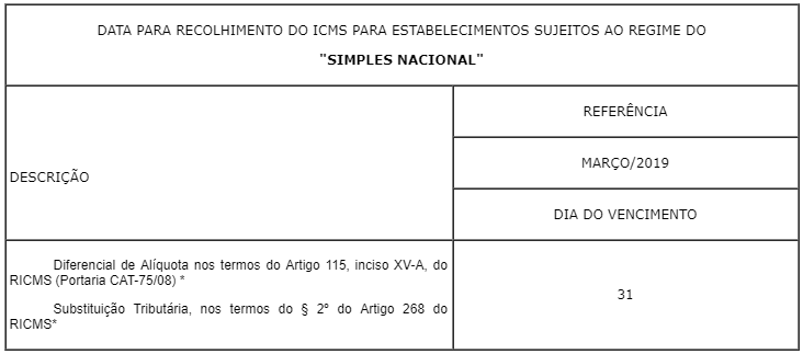 Pequeno Porte – “Simples Nacional”, de mercadorias, oriundas de outro Estado ou do Distrito Federal, deve ser recolhido até o último dia do segundo mês subsequente ao da entrada.