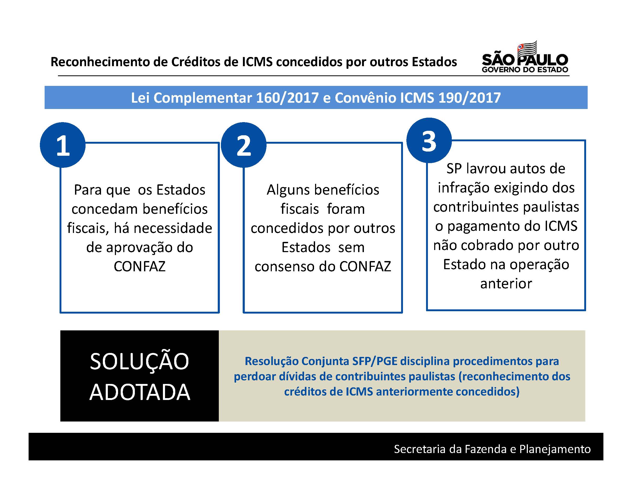 O Estado de São Paulo reconhecerá os créditos de ICMS após a verificação do atendimento das exigências, entre elas a confirmação de que os débitos de ICMS são de fato decorrentes de benefícios fiscais concedidos anteriormente à edição da Lei Complementar nº 160/2017 – e, portanto, irregulares até aquela data – e a confirmação de que houve o atendimento de todas as condições por parte do Estado de origem.